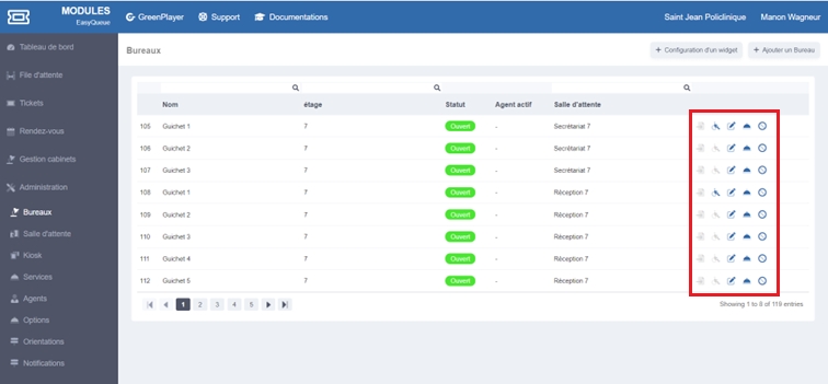 By clicking on the "Service" icon, you can restrict or authorize the services that can be called by each office. Please note, however, that this authorization cannot override the restrictions linked to the agent present in the office.