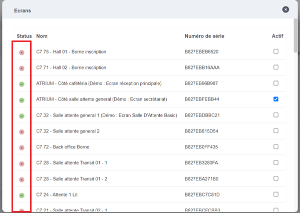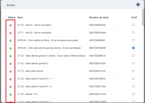 Clicking on the "Screens" icon brings up a window with information on the status of each screen.